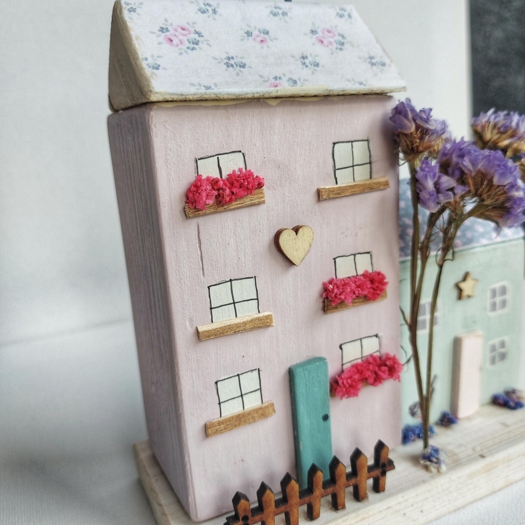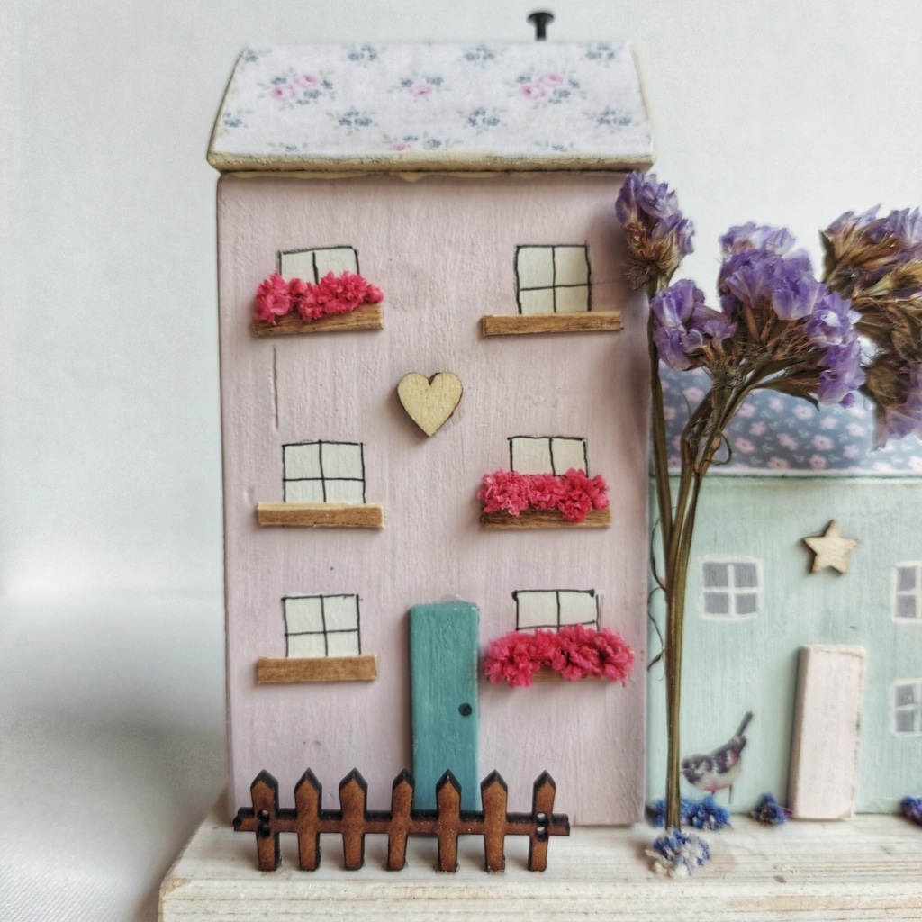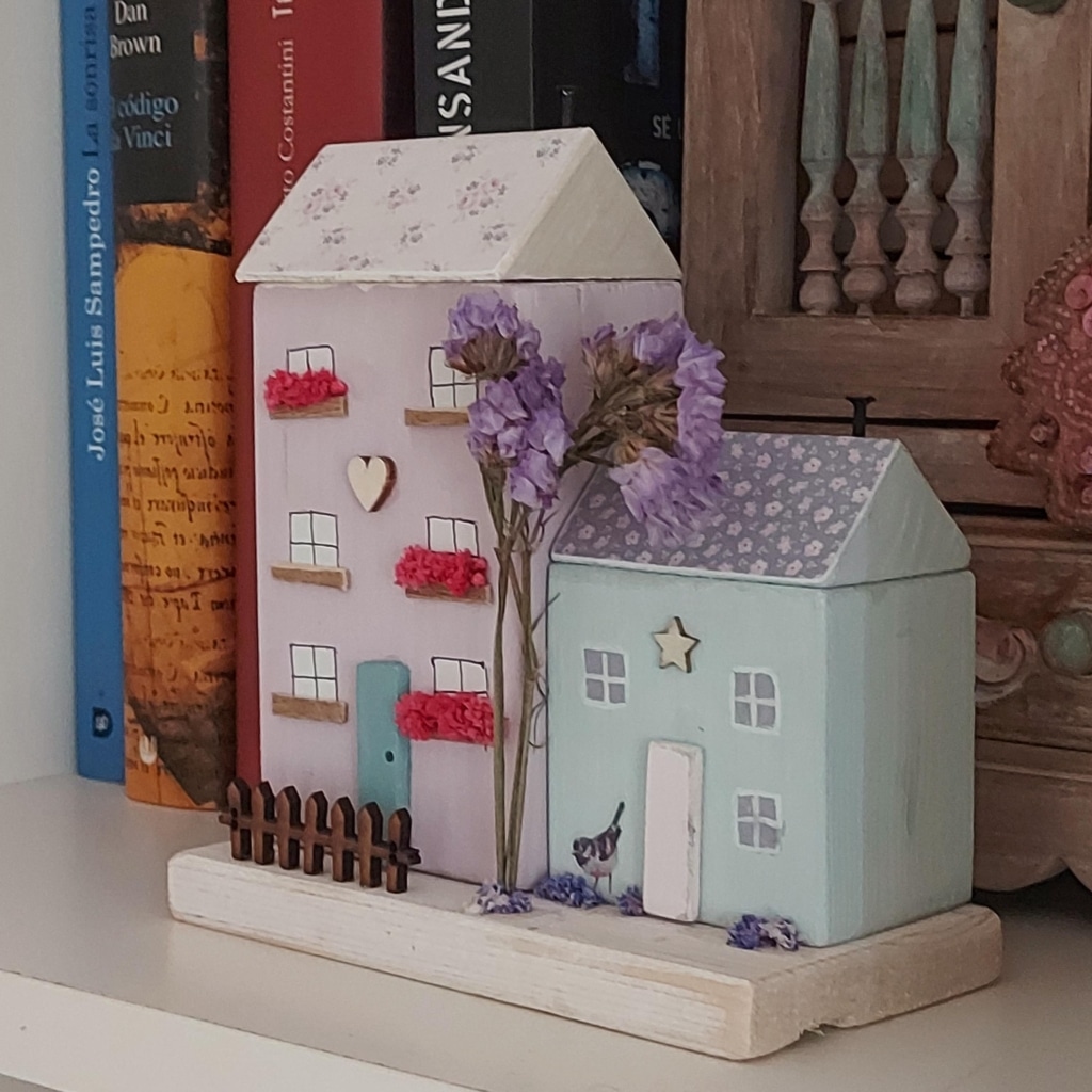 Estas casitas están elaboradas con madera de pino certificada FSC y decorada con papel sin ácido, pintura a la tiza, pintura acrílica y flores preservadas. Cada ventana, tejado y macetero ha sido trabajado con delicadeza, como si se tratara de una miniatura salida de un cuento rústico. El pequeño clavo que hace de chimenea es el remate perfecto para esta composición llena de alma.