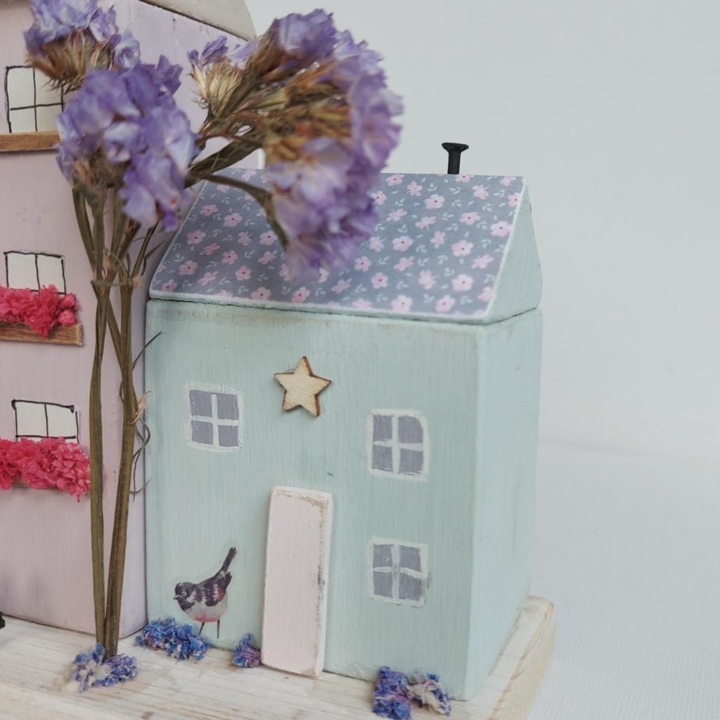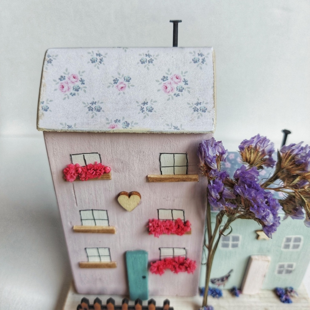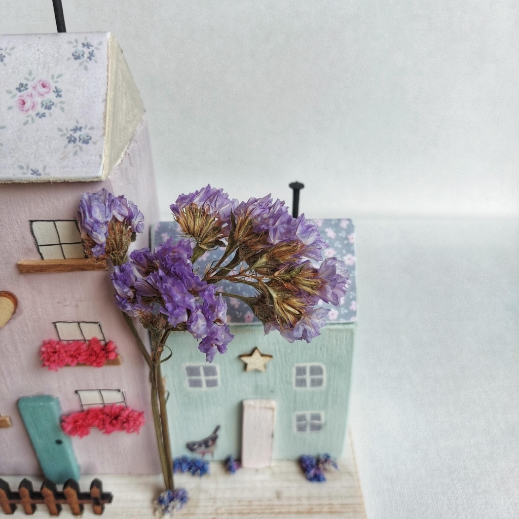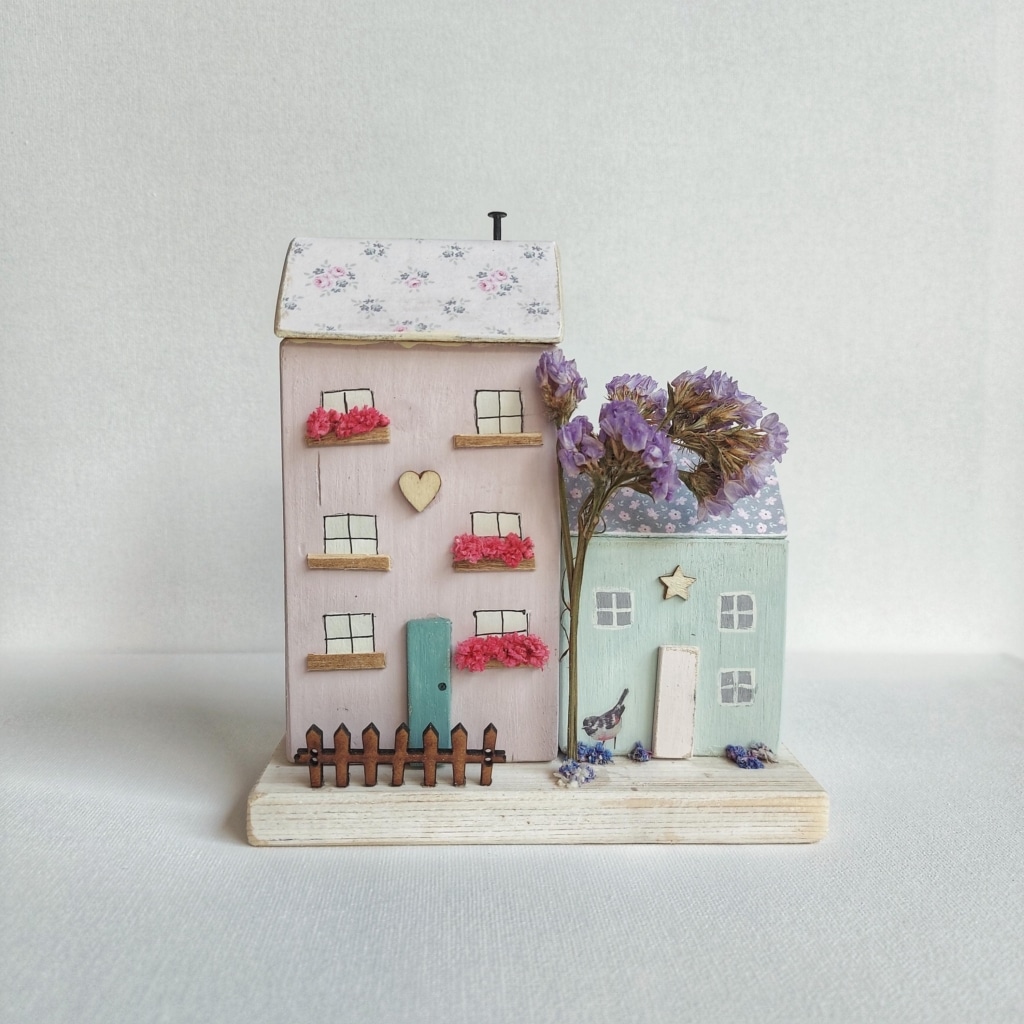 Estas casitas están elaboradas con madera de pino certificada FSC y decorada con papel sin ácido, pintura a la tiza, pintura acrílica y flores preservadas. Cada ventana, tejado y macetero ha sido trabajado con delicadeza, como si se tratara de una miniatura salida de un cuento rústico. El pequeño clavo que hace de chimenea es el remate perfecto para esta composición llena de alma.