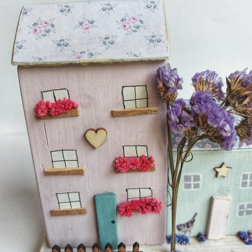 Cada casita es cortada, lijada, pintada y montada artesanalmente en mi taller.