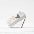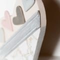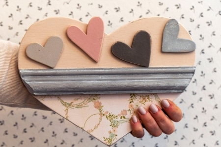 Este corazón está cortado en una sola pieza y decorado con una moldura de madera de pino y cuatro pequeños corazones. Para decorar la parte inferior he utilizado papel libre de ácidos. Está pintado con pintura a la tiza en tonos grises y rosas.