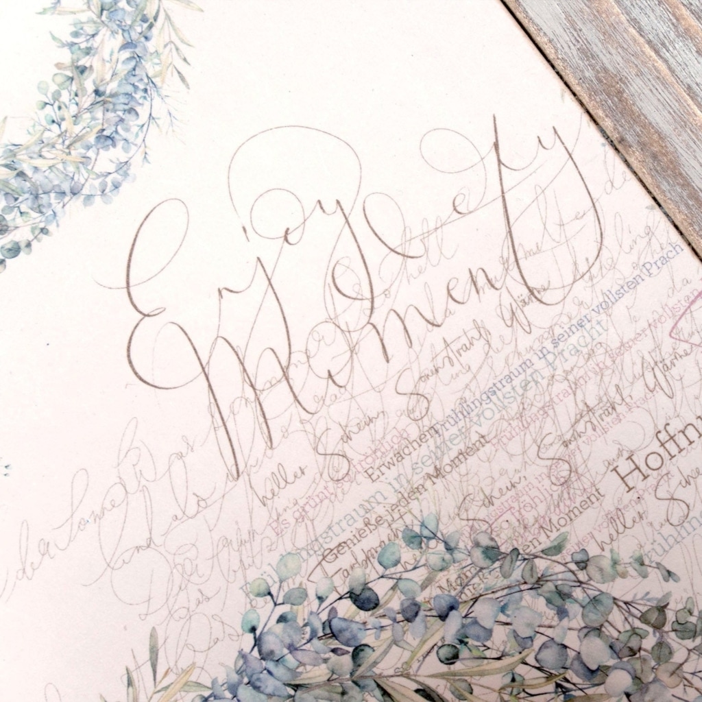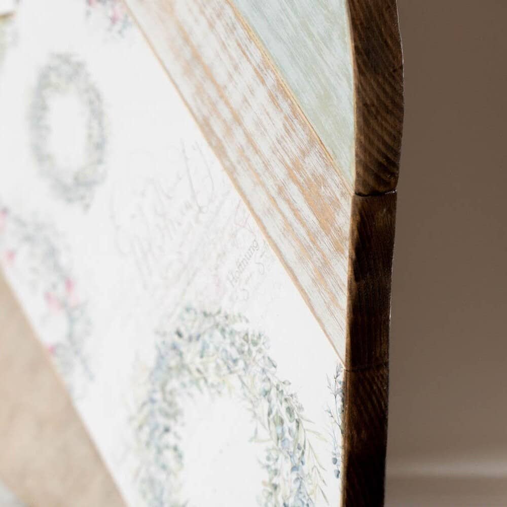 Está hecho con listones de madera de pino de diferentes medidas encolados entre si mediante un sistema de sujeción interna. Para su decoración he utilizado pintura a la tiza en tonos verdes y blanco, papel libre de ácidos y cera natural de abejas en tono oscuro. Dos de sus listones están decapados.