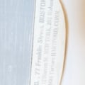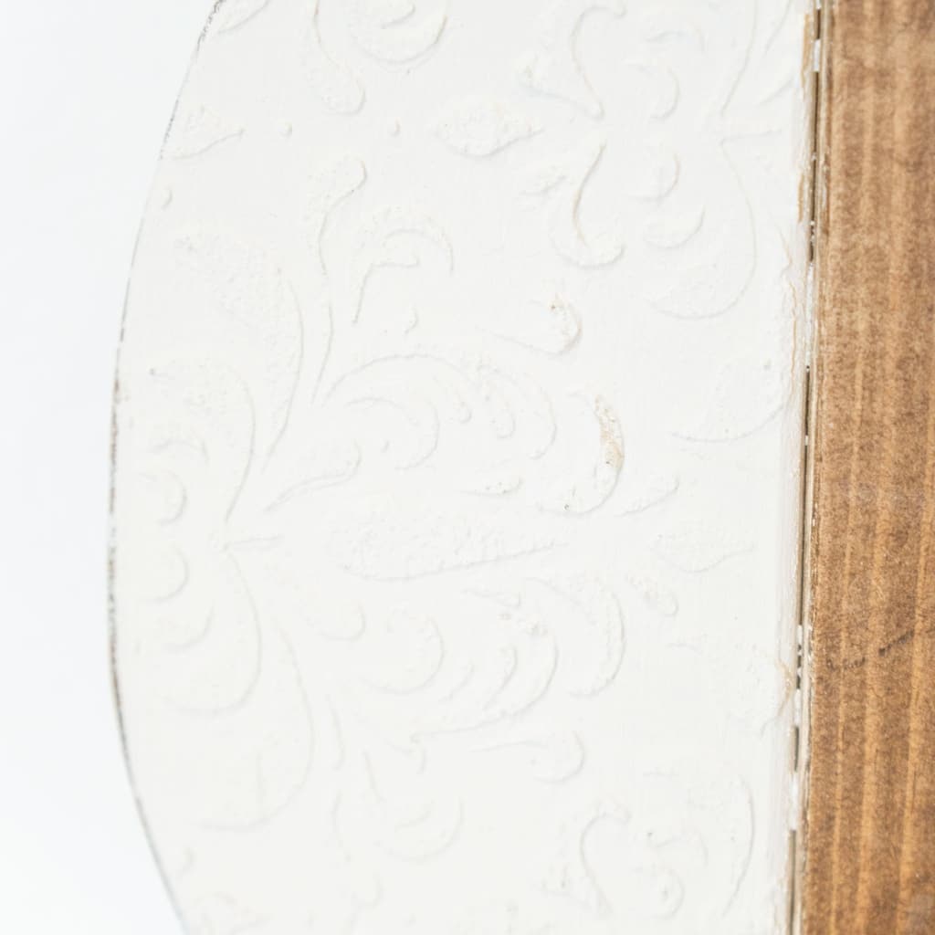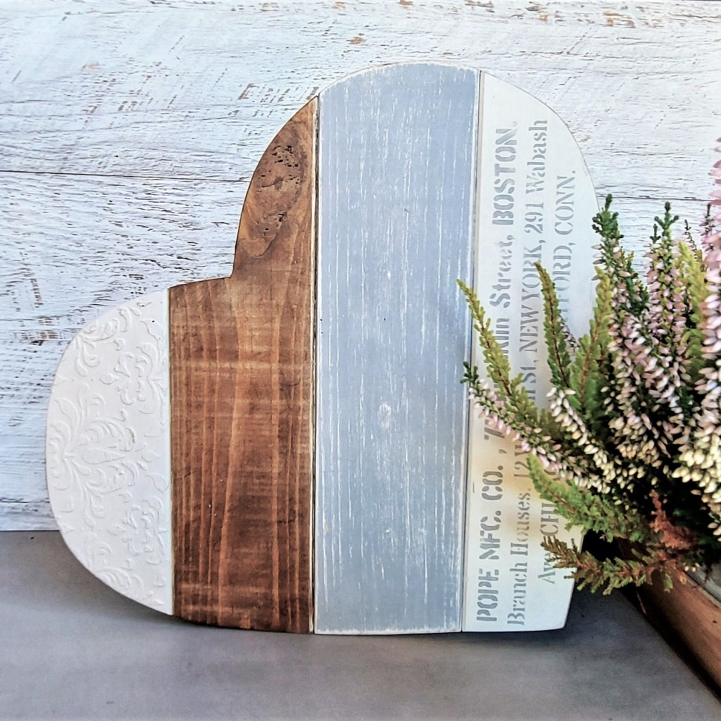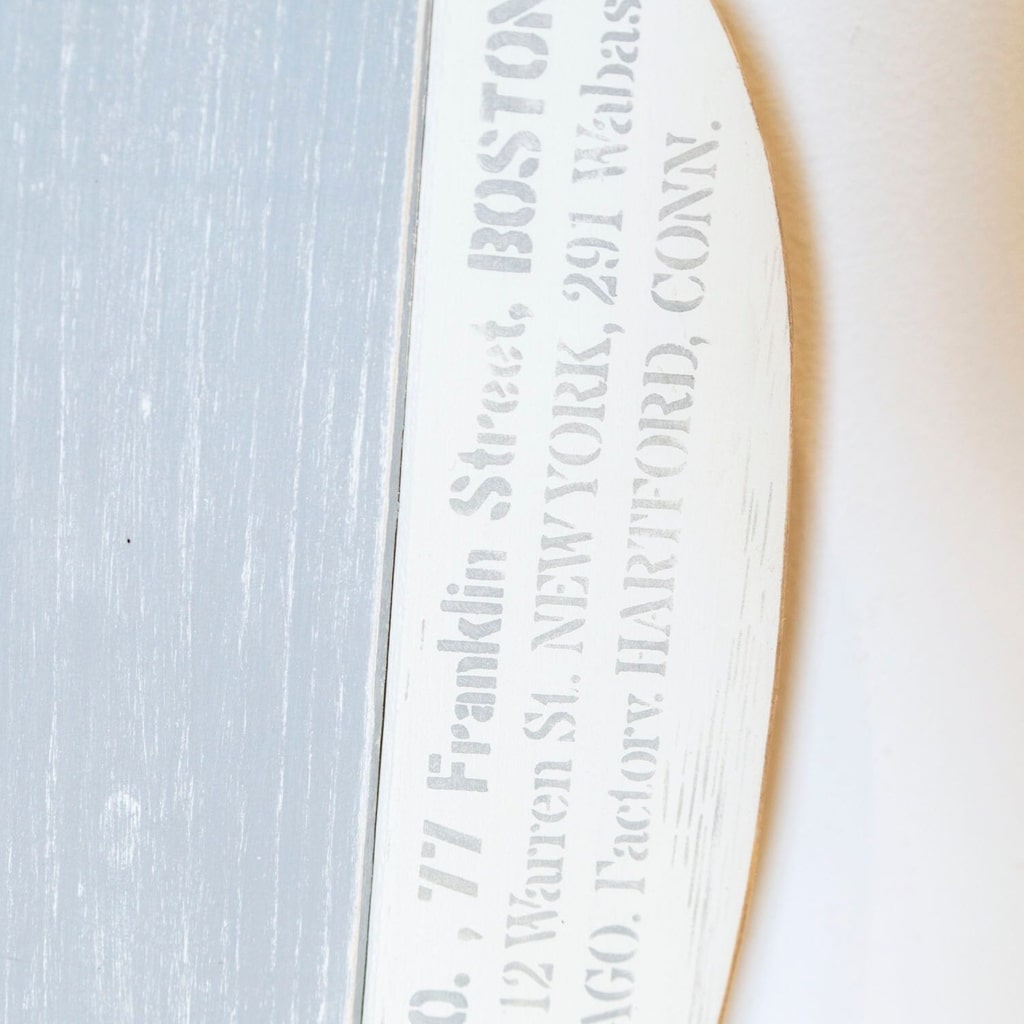 Los listones están encolados entre si y a su vez sobre una base de madera DM. Estos listones están teñidos con cera natural de abejas de color oscuro, pintados con pintura a la tiza en color gris y blanco. En uno de ellos hice con una plantilla una inscripción de estilo industrial y en otro realicé un fondo texturado también con plantilla y pasta de modelar. Finalmente decapé ligeramente.