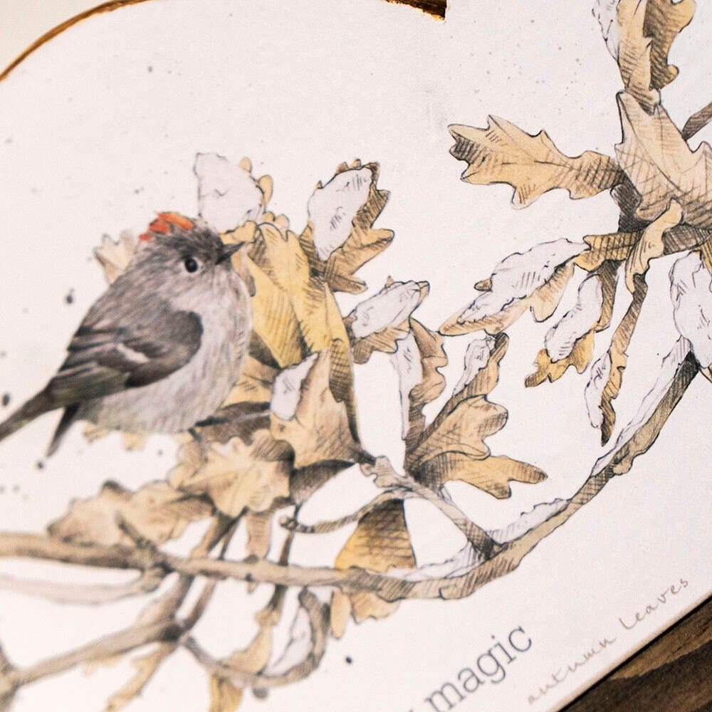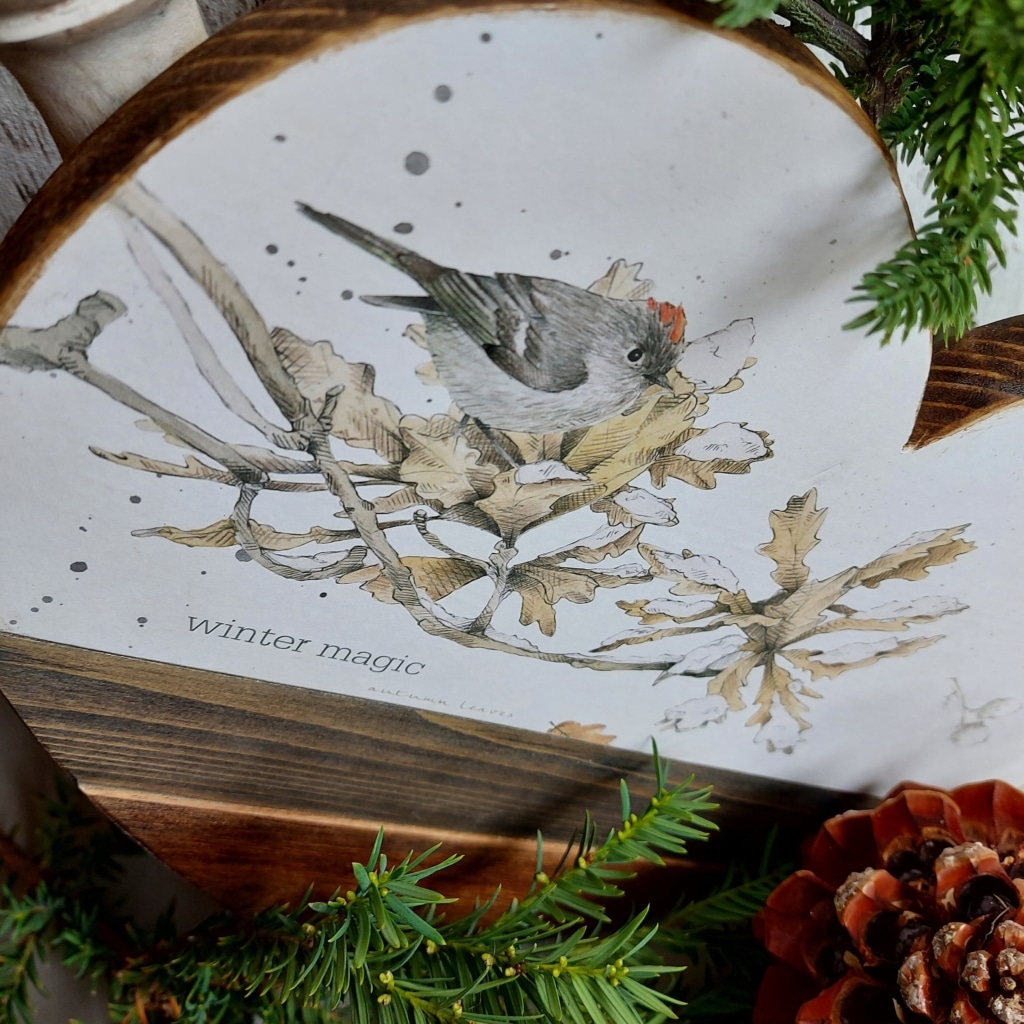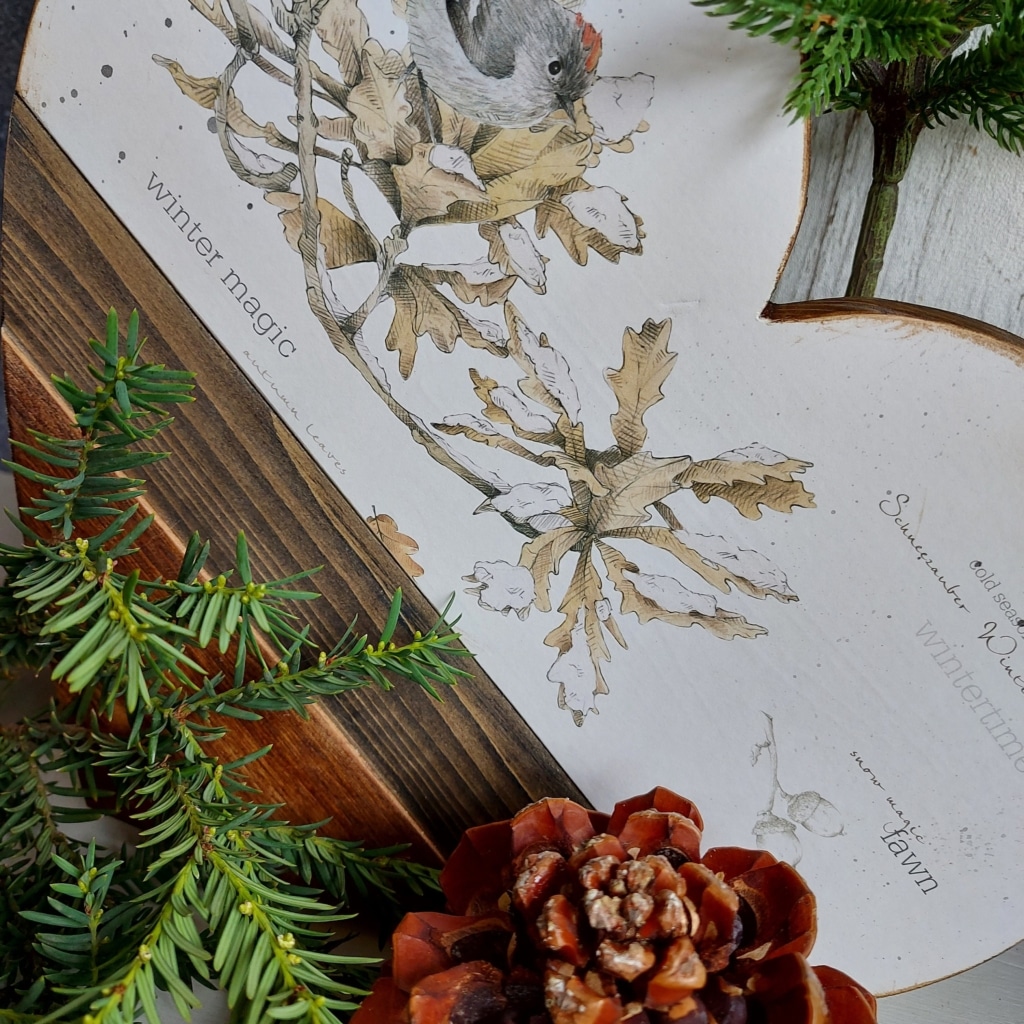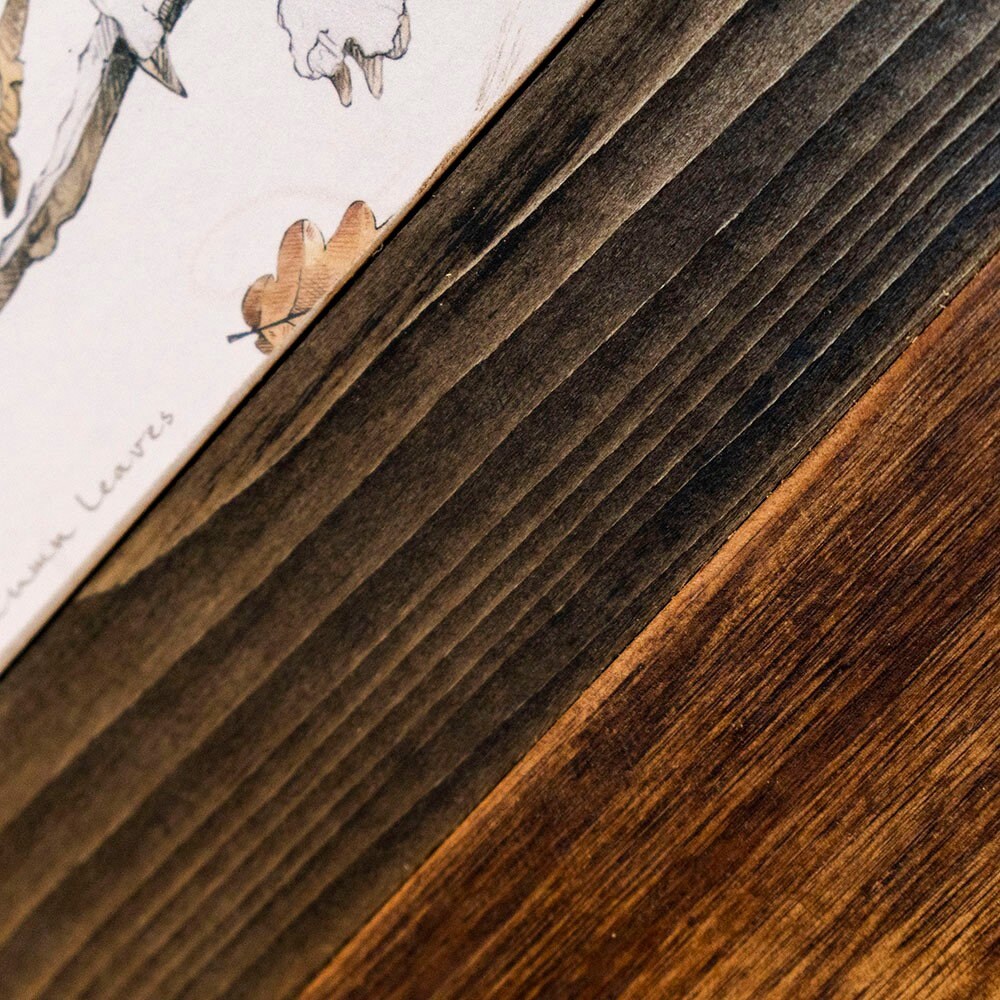 Los tres listones están pegados entre sí y a su vez lo están a una pieza de madera DM. Están teñidos de color oscuro con cera natural de abejas. Para decorar el primer listón he utilizado papel libre de ácidos con un bonito pájaro de aires nórdicos,.