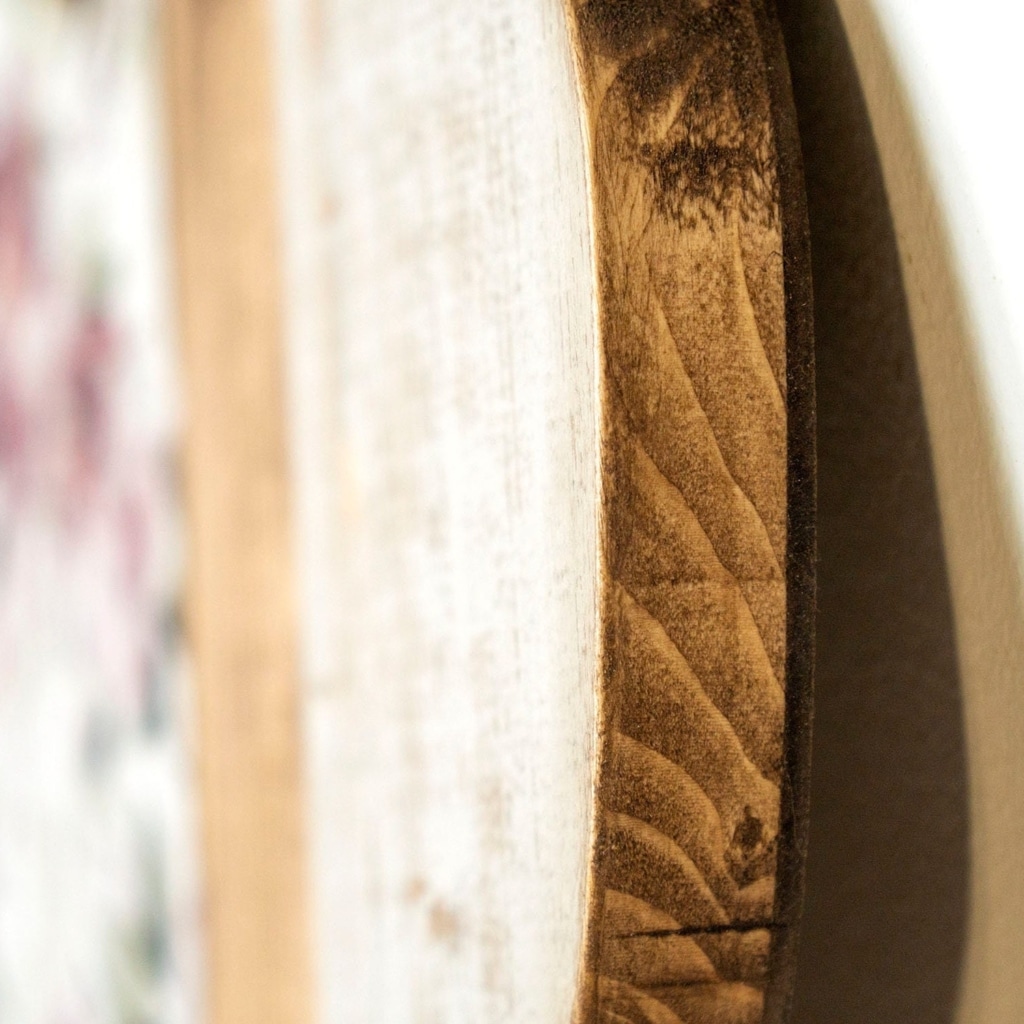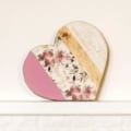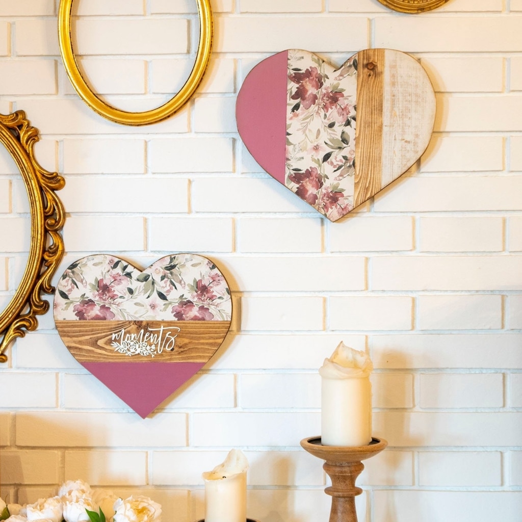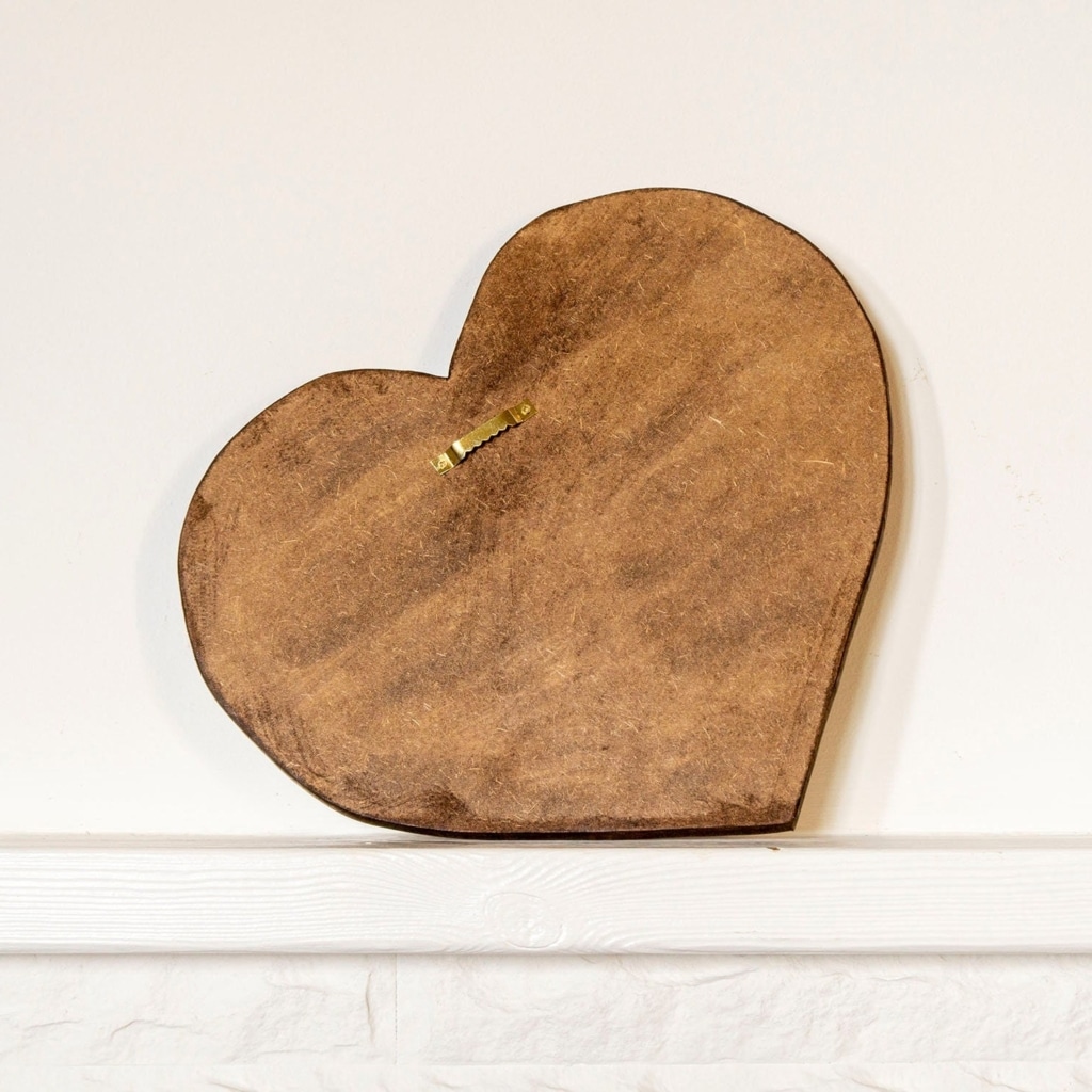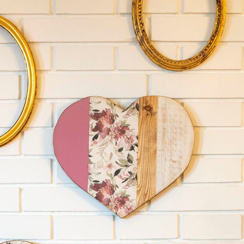 Cada corazón está compuesto por cuatro listones de madera fijados sobre una base de DM, pintados a mano con pintura a la tiza en tono ciruela y acabados con cera natural de abejas. El listón central está decorado con papel de servilleta artesanal, aportando un toque único a cada pieza.