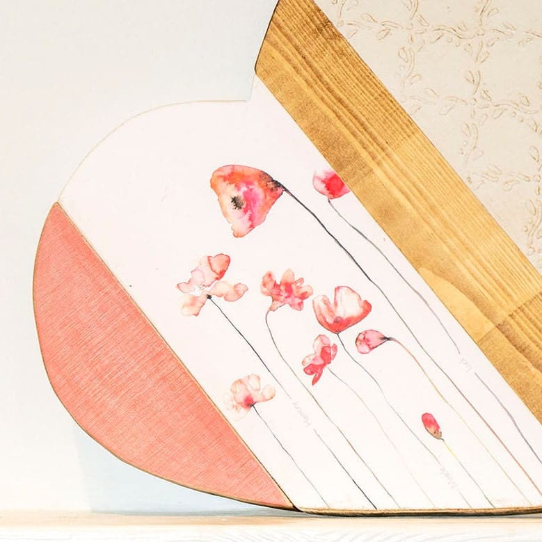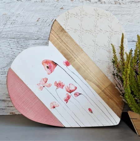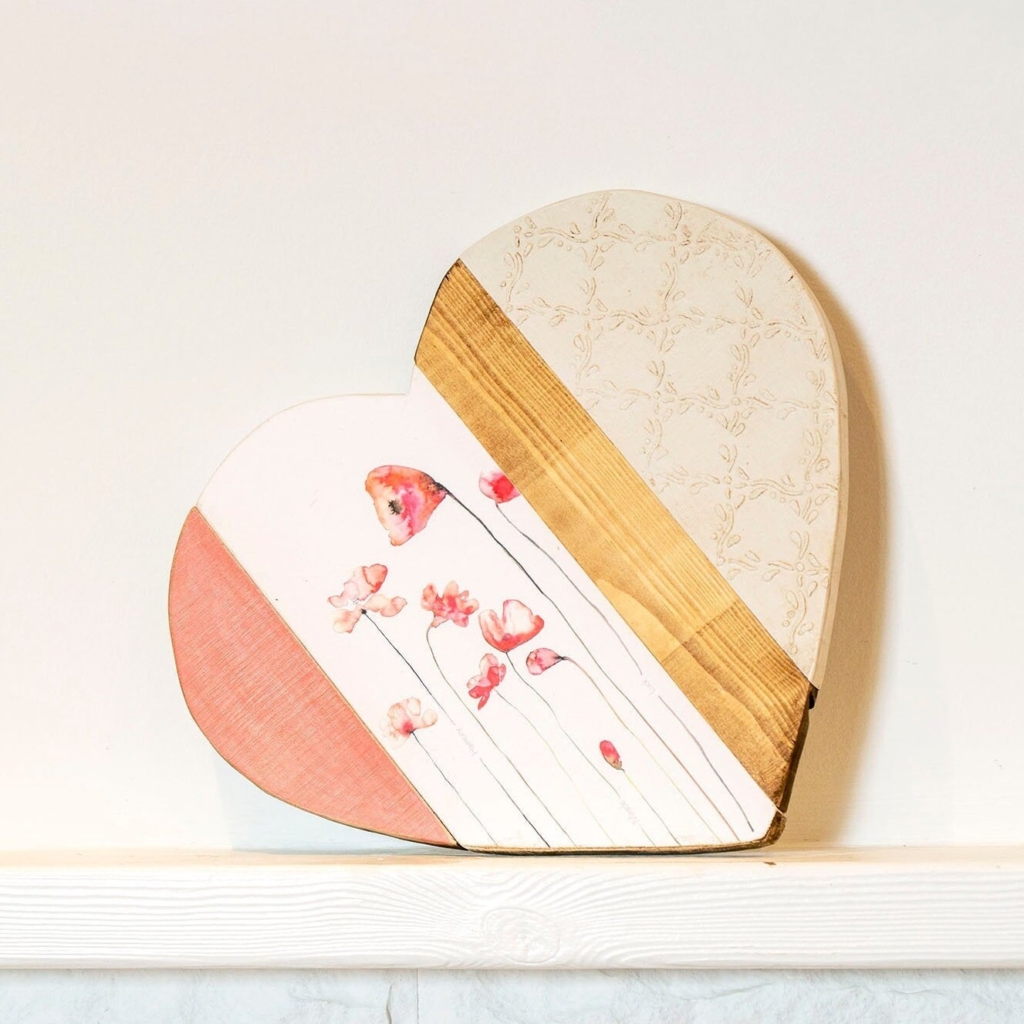 Añade un toque de calidez y encanto a tu hogar con este corazón de madera rústico, decorado con un delicado diseño de amapolas en acuarela y relieves texturizados. Hecho a mano con materiales naturales, esta pieza combina estilo campestre y vintage, ideal para la decoración primaveral de salones, dormitorios o recibidores con un aire acogedor.
