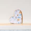 Para el corazón grande he utilizado un bonito papel libre de ácidos en tonos azules. El pequeño está encerado con cera natural de abejas de color oscuro. Lleva una inscripción en color negro y está decorado con transfers en azul y negro.